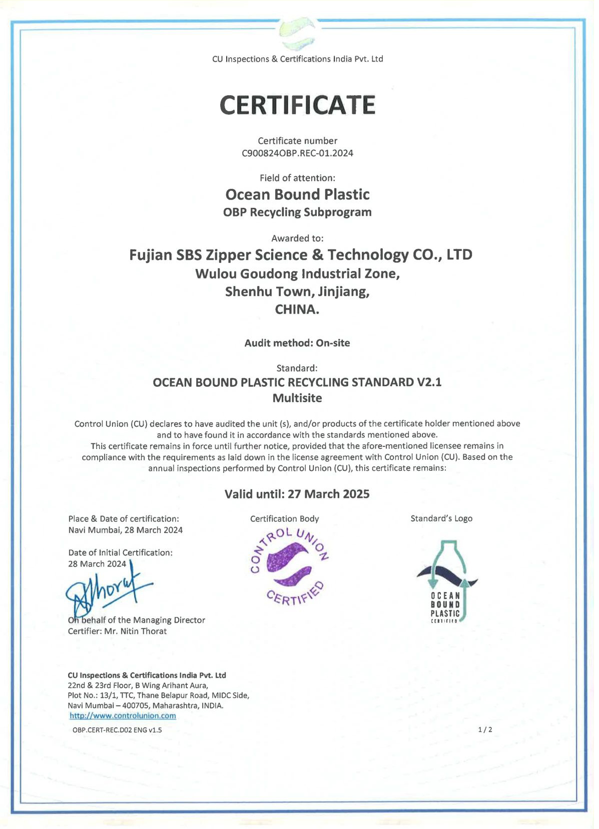 2024年3月28日,福建潯興拉鏈科技股份有限公司通過OBP海洋塑料認證,證書編號:C900824OBP.REC01.2024。